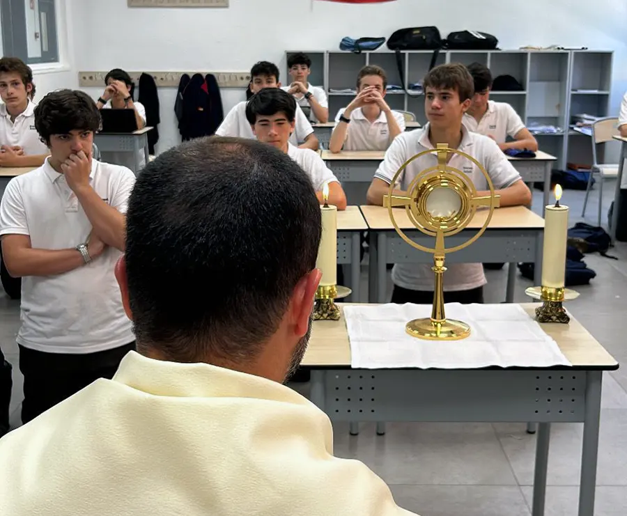 El P. José María Moriano, L.C., llevó el Santísimo por las clases de Primaria y ESO. En cada una, se hizo una oración e impartió la bendición a todos los alumnos y a los profesores.