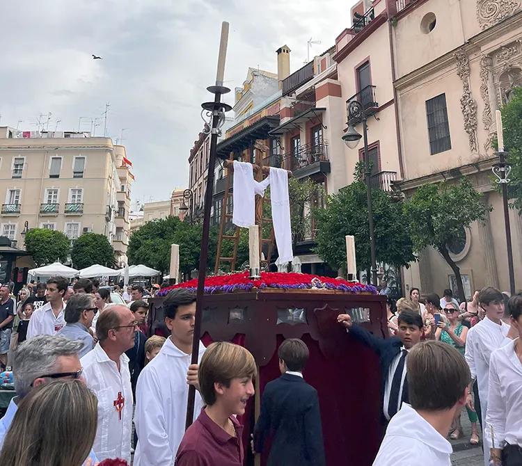 Los niños desempeñaron los roles de la procesión haciéndose responsables de todas funciones: costaleros, capataces, incensarios y portadores de la naveta, entre otros. Las niñas acompañaban vestidas con traje de gitana. Juan Gil-Arévalo, uno de los capataces, estudiante de 1º de la ESO, nos explica que “la verdad que fue muy bonito el apostolado… había mucha gente viéndonos, y la gente pensaba que cómo estos niños y jóvenes del ECYD tan contentos y tan alegres pueden estar tan comprometidos y encargarse de llevar este paso”.