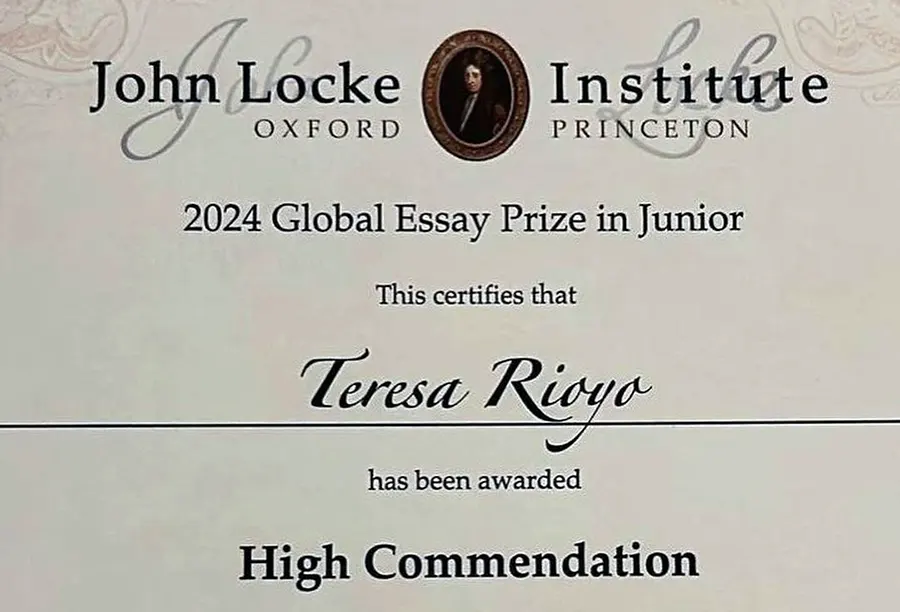 Teresa Rioyo, alumna de 4º de la ESO del Highlands School El Encinar, ha sido reconocida por el John Locke Institute por su ensayo científico sobre el reemplazo de los humanos por máquinas y su impacto en el mercado de trabajo. El ensayo, titulado “Will machines replace humans? When will advancing technology make most of us unemployable? What should we do about this?”, ha sido revisado por académicos de prestigio de las universidades de Oxford y Cambridge, recibiendo el Diploma High Commendation por su calidad y profundidad críticas.