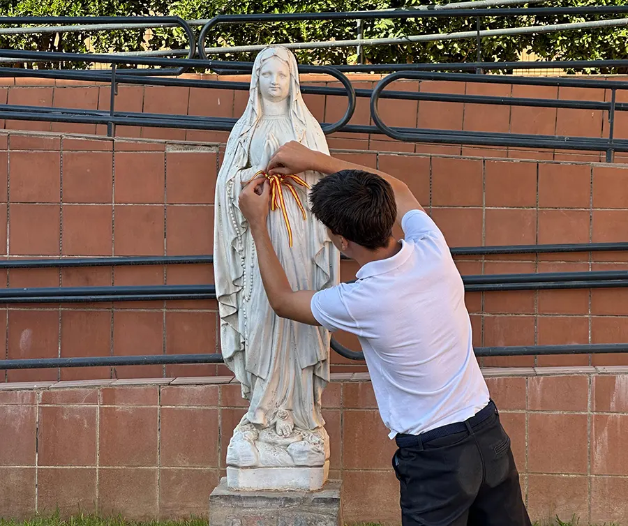 En la Secundaria masculina, los cursos se organizaron por turnos para rezar un misterio del Rosario en el patio, ante la imagen de la Virgen. Cada clase escribió una intención por la que deseaba ofrecer su misterio en una cinta, que luego ataron en las manos de la Virgen al concluir el rezo. Los profesores ofrecieron el quinto misterio, simbolizando un “Rosario al cielo” en nombre de toda la comunidad educativa.