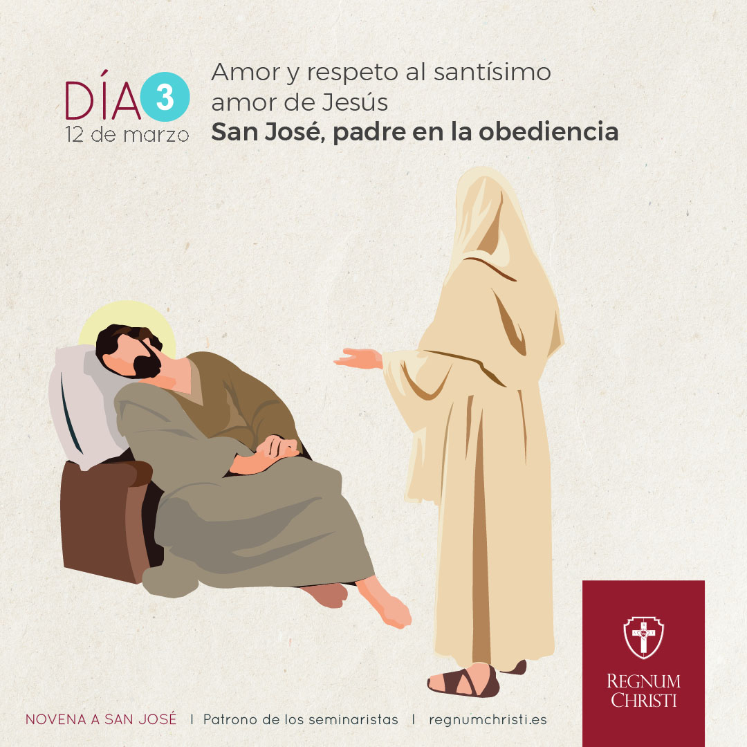 En el primer sueño el ángel lo ayudó a resolver su grave dilema: «No temas aceptar a María, tu mujer, porque lo engendrado en ella proviene del Espíritu Santo. Dará a luz un hijo, y tú le pondrás por nombre Jesús, porque él salvará a su pueblo de sus pecados» (Mt 1,20-21). Su respuesta fue inmediata: «Cuando José despertó del sueño, hizo lo que el ángel del Señor le había mandado» (Mt 1,24). Con la obediencia superó su drama y salvó a María.
