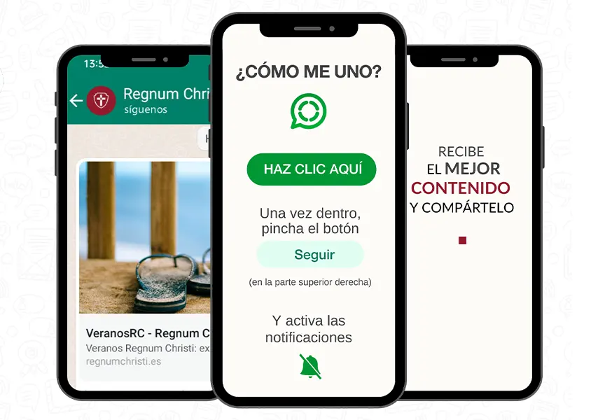 El canal de WhatsApp es una vía directa, no invasiva y segura para recibir actualizaciones de la vida del Regnum Christi en España. Tú decides cuándo leer los mensajes, nadie ve tu número y solo puedes reaccionar con emoticonos.